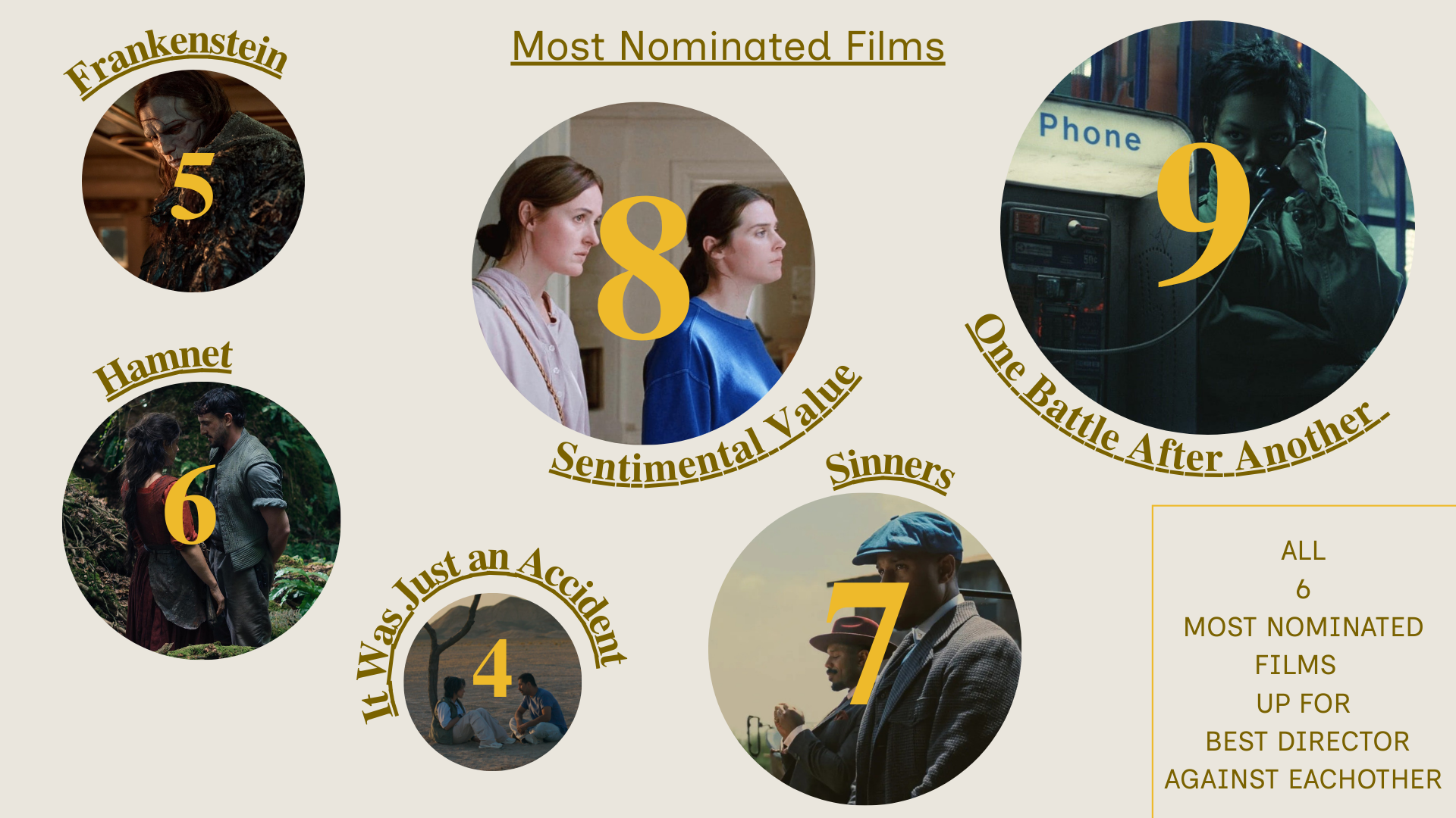 Because the Golden Globes honor dramas and musicals/comedies separately, these films will compete for the top prizes in different categories. “One Battle After Another” is up for best motion picture – musical or comedy, alongside “Blue Moon,” “Bugonia,” “Marty Supreme,” “No Other Choice” and “Nouvelle Vague.” “Sentimental Value” and “Sinners” will vie for best drama alongside “Frankenstein,” “Hamnet,” “It Was Just an Accident” and “The Secret Agent.”